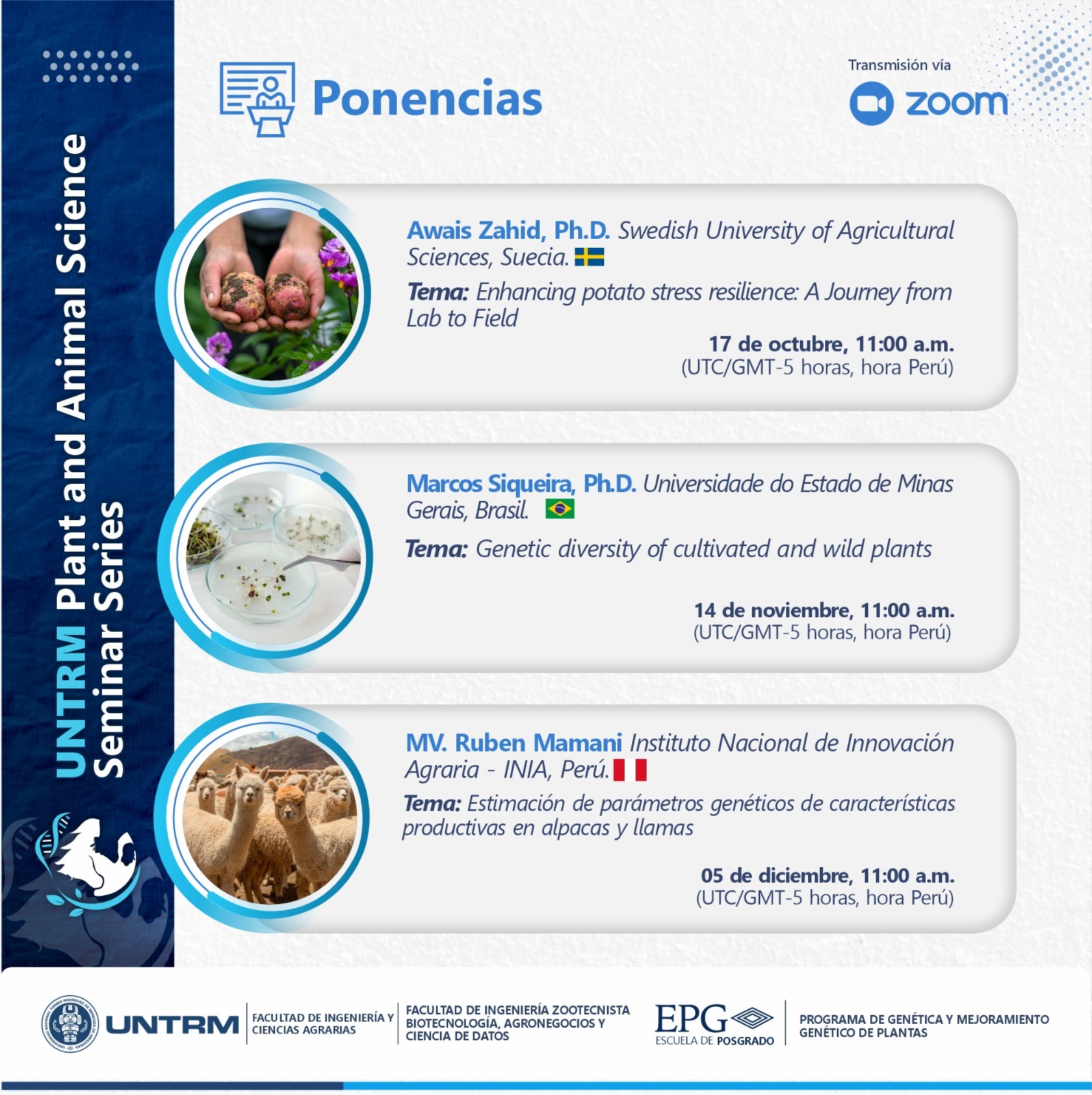 Esta gran ronda de seminarios se realiza en el marco del Programa de Genética y Mejoramiento Genético de Plantas de la Universidad Nacional Toribio Rodríguez de Mendoza de Amazonas (UNTRM) 📚. Tiene como objetivo estimular el uso de técnicas modernas en el área de Ciencias de Plantas y Animales 🐂🌾🌽🥔🐮 y reforzar el networking académico.